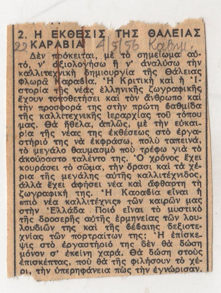 Απόκομμα, χαρτί, στα ελληνικά, δημοσίευσης κριτικής έκθεσης της Θάλειας Φλωρά-Καραβία, η οποία διεξάγεται στο καλλιτεχνικό της εργαστήριο.