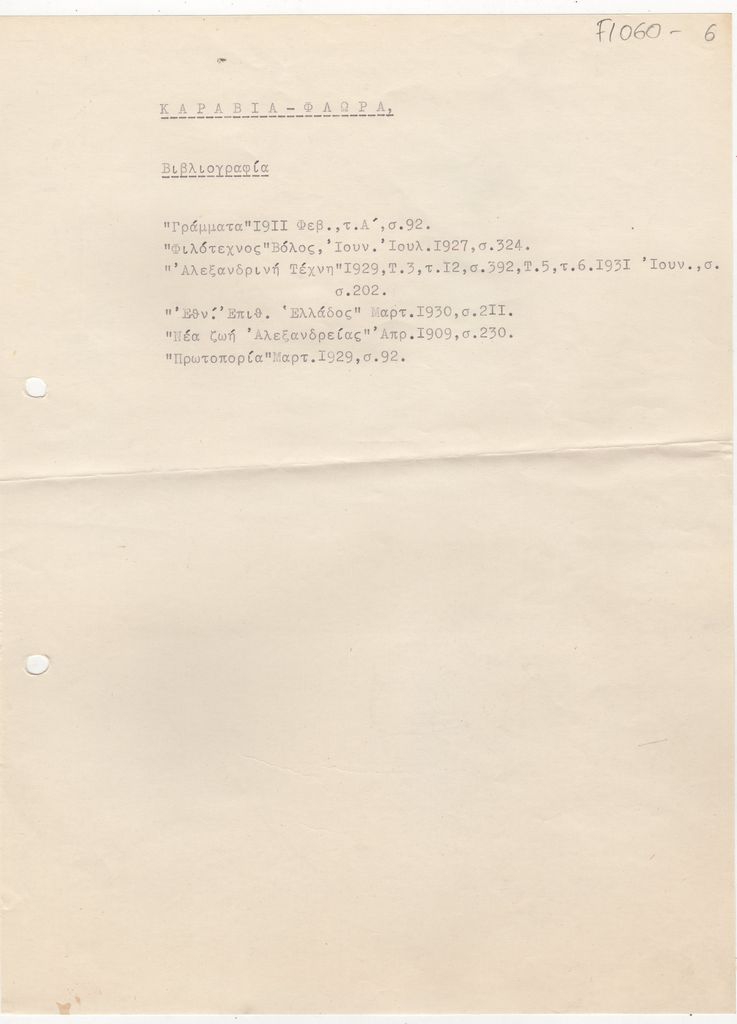 Βιβλιογραφία, δακτυλόγραφη, χαρτί, 29.5×21 εκ., στα ελληνικά, για τη Θάλεια Φλωρά-Καραβία.