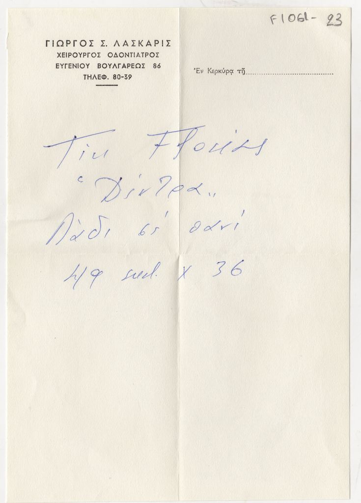 Χειρόγραφο, χαρτί, 20×14 εκ., στα ελληνικά, με πληροφορίες έργου του Tin Florias.