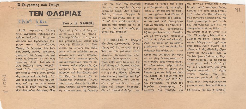 Απόκομμα, χαρτί, 2 φφ, 13.5×29,5 και 18×18 εκ., στα ελληνικά, δημοσίευσης αναφερόμενης στο θάνατο του Tin Florias. Δίνονται πληροφορίες για τη ζωή και το έργο του καλλιτέχνη.
