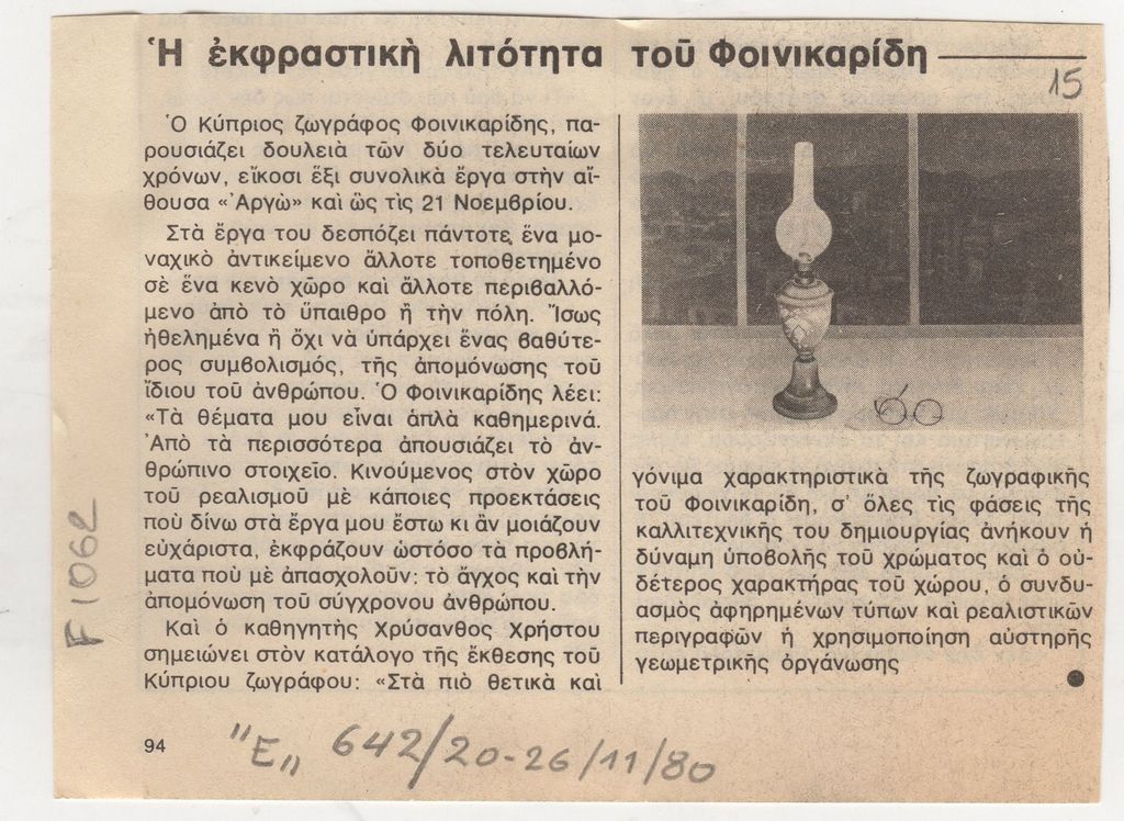 Απόκομμα, χαρτί, 10,5×13,5 εκ., στα ελληνικά, δημοσίευσης κριτικής έκθεσης του Μιχαήλ (Μίκη) Φοινικαρίδη, η οποία διεξάγεται στην γκαλερί Αργώ στην Αθήνα.