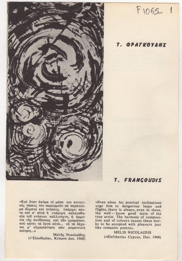 Έντυπο, χαρτί, 21,5×14,5 εκ., στα ελληνικά και σε αγγλική μετάφραση έκθεσης του Τάκη Φραγκούδη.