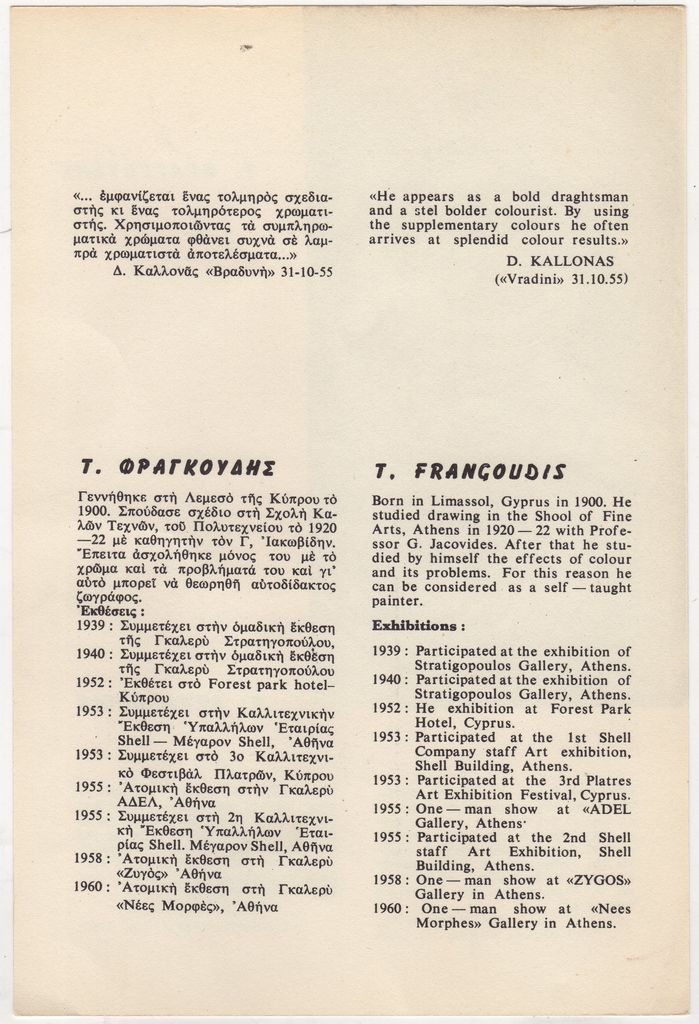 Αναγράφεται βιογραφικό του καλλιτέχνη και κριτική για το έργο του, δημοσιευμένη στην “Ελευθερία” Κύπρου.