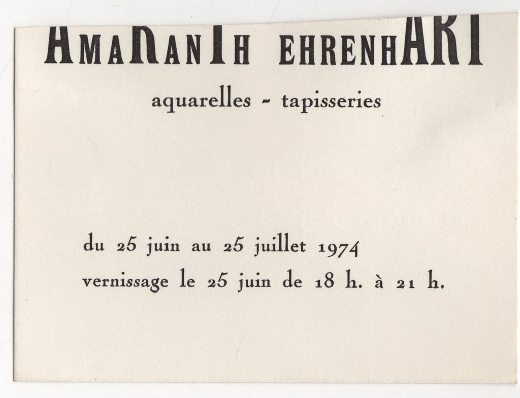 Απόκομμα εντύπου, μονόφυλλου, στα γαλλικά, από χαρτόνι, 7,5×10,5 εκ. Πρόσκληση έκθεσης της Amaranth Ehrenhart με γενικό τίτλο “Aquarelles – Tapisseries” το 1974. Στην πίσω όψη χειρόγραφες σημειώσεις για τους αδελφούς Φυτάλη.