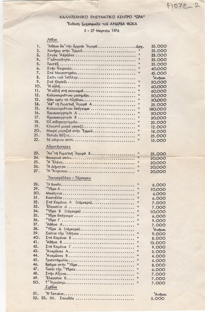 Τιμοκατάλογος, χαρτί, 34×22 εκ., στα ελληνικά, έργων του Ανδρέα Φωκά, τα οποία παρουσιάζονται σε έκθεσή του στο Καλλιτεχνικό Πνευματικό Κέντρο Ώρα στην Αθήνα.