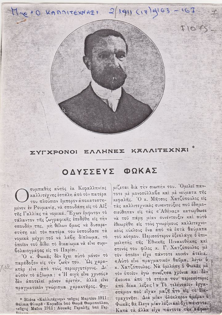 Φωτοαντίγραφο, χαρτί, 6 φφ, 21×15 εκ., στα ελληνικά, δημοσίευσης κειμένου για τη ζωή και το έργο του Οδυσσέα Φωκά. Εικονογραφείται και φέρει επιγραφές.