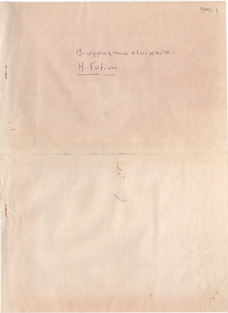 Κείμενο, δακτυλόγραφο, με χειρόγραφες συμπληρώσεις, στα ελληνικά και γαλλικά, σε χαρτί, 9 φφ, 29,0×21,2 εκ. Βιογραφικό σημείωμα της Χαρίκλειας Φωτίου-Χατζησάββα. Αναφέρονται σπουδές, ατομικές και ομαδικές εκθέσεις, μουσεία και ιδιωτικές συλλογές που κατέχουν έργα της. Φέρει επιγραφές.