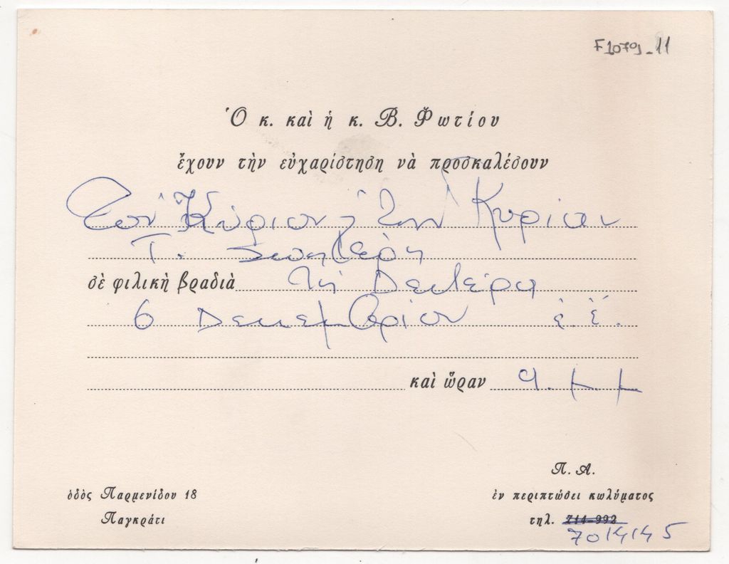 Έντυπο, μονόφυλλο, σε χαρτόνι, 11,5×15,0 εκ., συμπληρωμένο χειρόγραφα, με μπλε μελάνι, στα ελληνικά. Πρόσκληση σε φιλική βραδιά του ζεύγους Φωτίου προς το ζεύγος Σπητέρη, Αθήνα, 06/12/19..