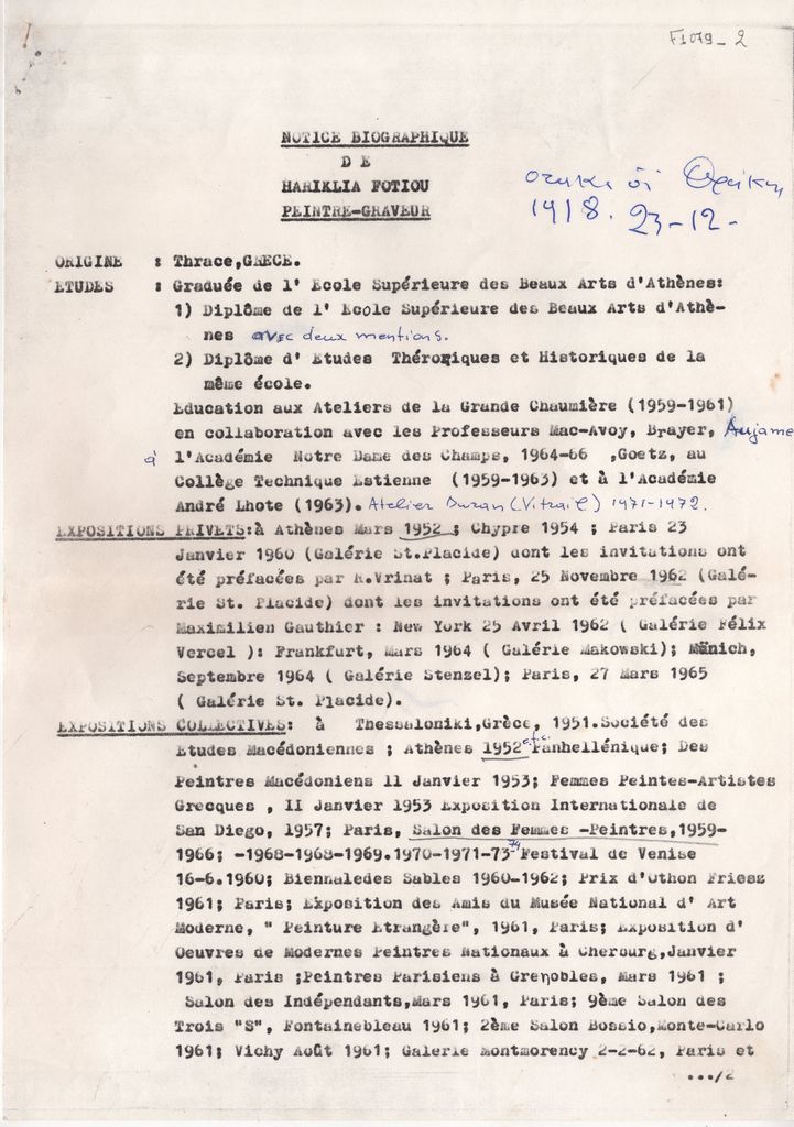 Κείμενο, δακτυλόγραφο, με χειρόγραφες διορθώσεις και συμπληρώσεις, στα γαλλικά, σε χαρτί, 4 φφ, 29,8×21,0 εκ. Βιογραφικό σημείωμα της ζωγράφου Χαρίκλειας Φωτίου-Χατζησάββα. Αναφέρονται σπουδές, ατομικές και ομαδικές εκθέσεις, διακρίσεις και βραβεία, μουσεία και ιδιωτικές συλλογές που κατέχουν έργα της και διοικητικές θέσεις.