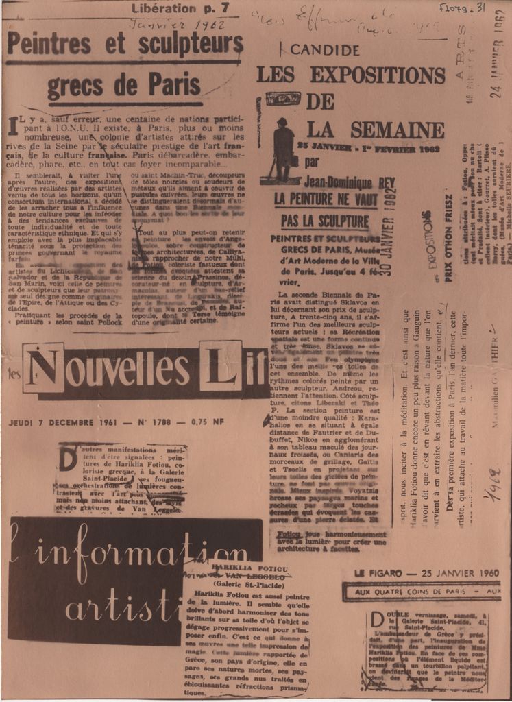Φωτοαντίγραφο κολλάζ αποκομμάτων από τον γαλλικό τύπο, χαρτί, 29,8×21,0 εκ. Δημοσιεύματα για τη ζωγράφο Χαρίκλεια Φωτίου-Χατζησάββα και την έκθεση Ελλήνων καλλιτεχνών στο Παρίσι. Καλύπτουν την περίοδο 1960-1962. Περιλαμβάνονται τα άρθρα: “Peintres et sculpteurs grecs de Paris”, “La peinture ne vaut pas la sculpture” κ.ά.