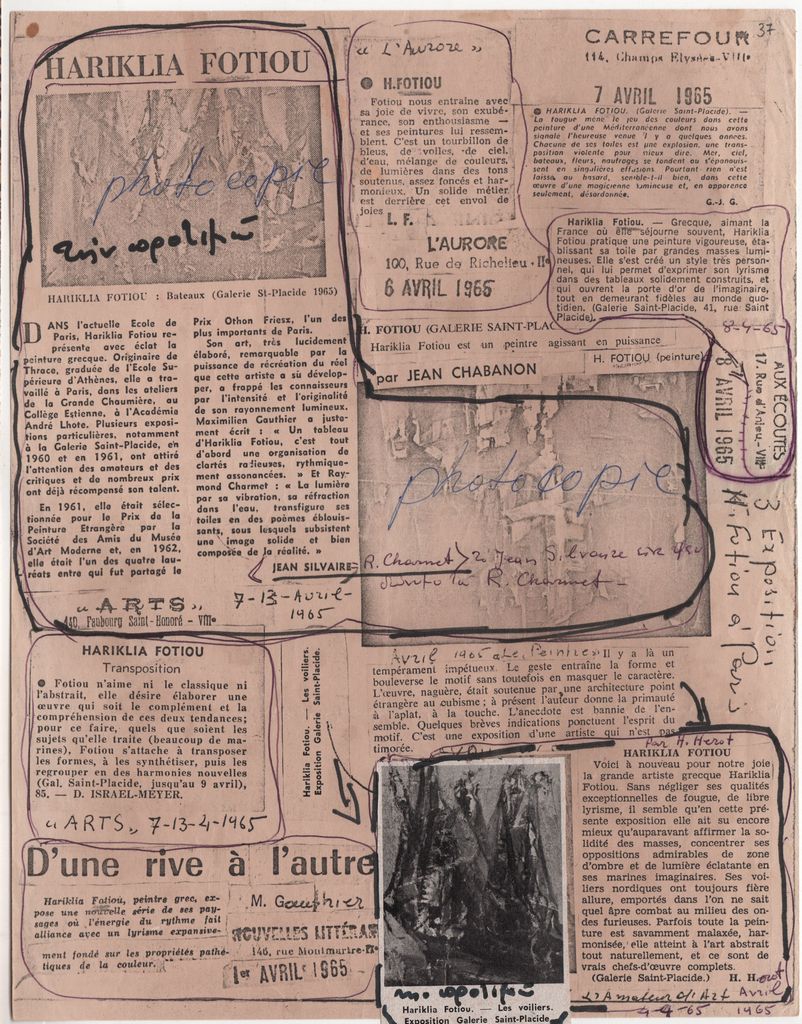 Κολλάζ» άρθρων από τον γερμανικό και γαλλικό τύπο για τη ζωγράφο Χαρίκλεια Φωτίου-Χατζησάββα του έτους 1965. Περιλαμβάνονται τα άρθρα: Jean Silvaire “Hariklia Fotiou”, “Hariklia Fotiou. Transposition” και άλλα άτιτλα δημοσιεύεματα. Αναπαραγωγές έργων. Στην επιφάνεια του τεκμηρίου επιγραφές.