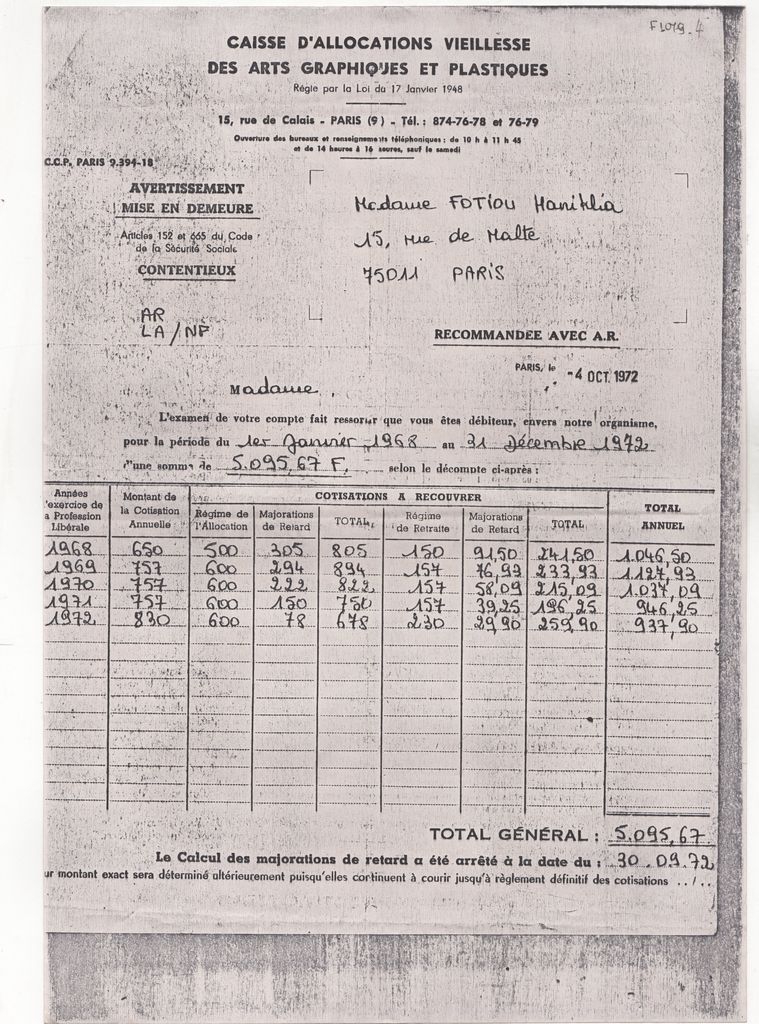 Φωτοαντίγραφο εντύπου, συμπληρωμένο χειρόγραφα, στα γαλλικά, σε χαρτί, 30,5×21,0 εκ. Ειδοποιητήριο εξόφλησης χρεών στο Ταμείο Συνταξιοδότησης, Παρίσι, 04/10/1972.