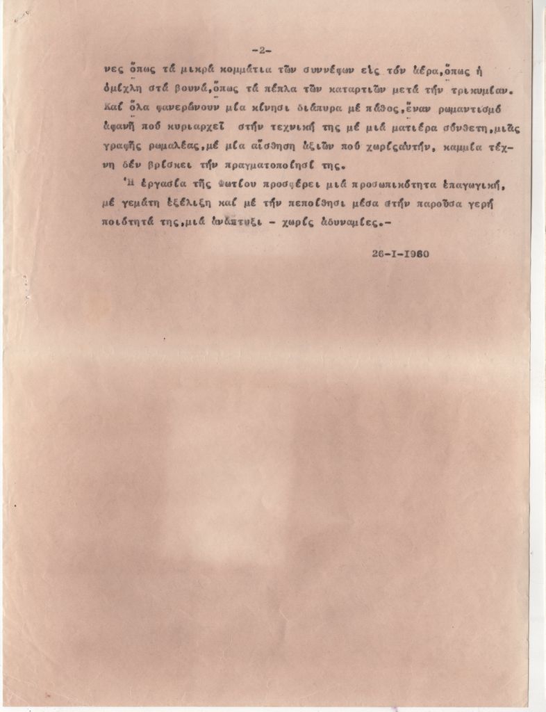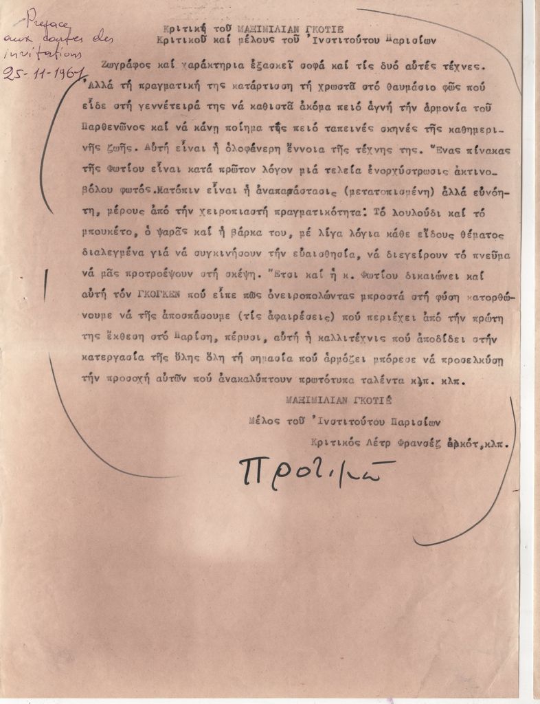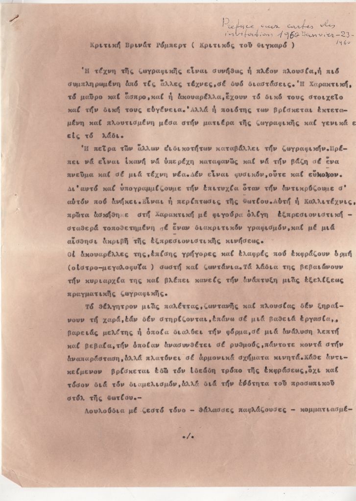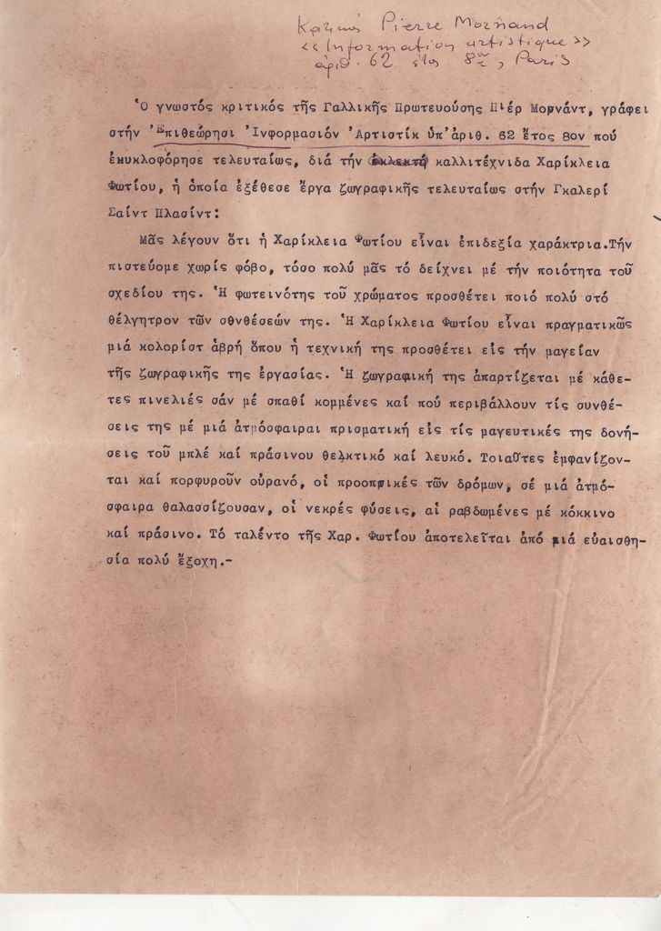 Κείμενο, δακτυλόγραφο, στα ελληνικά, σε χαρτί, 28,6×21,5 εκ. Μεταφράσεις αποδελτιωμένων άρθρων από τον γαλλικό τύπο για τη ζωγράφο Χαρίκλεια Φωτίου-Χατζησάββα της περιόδου 1960-1962. Περιλαμβάνονται κριτικές των P. Mormand, M. Gauthier και R. Vrina από τα εξής έντυπα: “L’Information Artistique” (τεύχος 62, έτος 8ο), “Le Temoin de la Vie” (07/06/1962).
