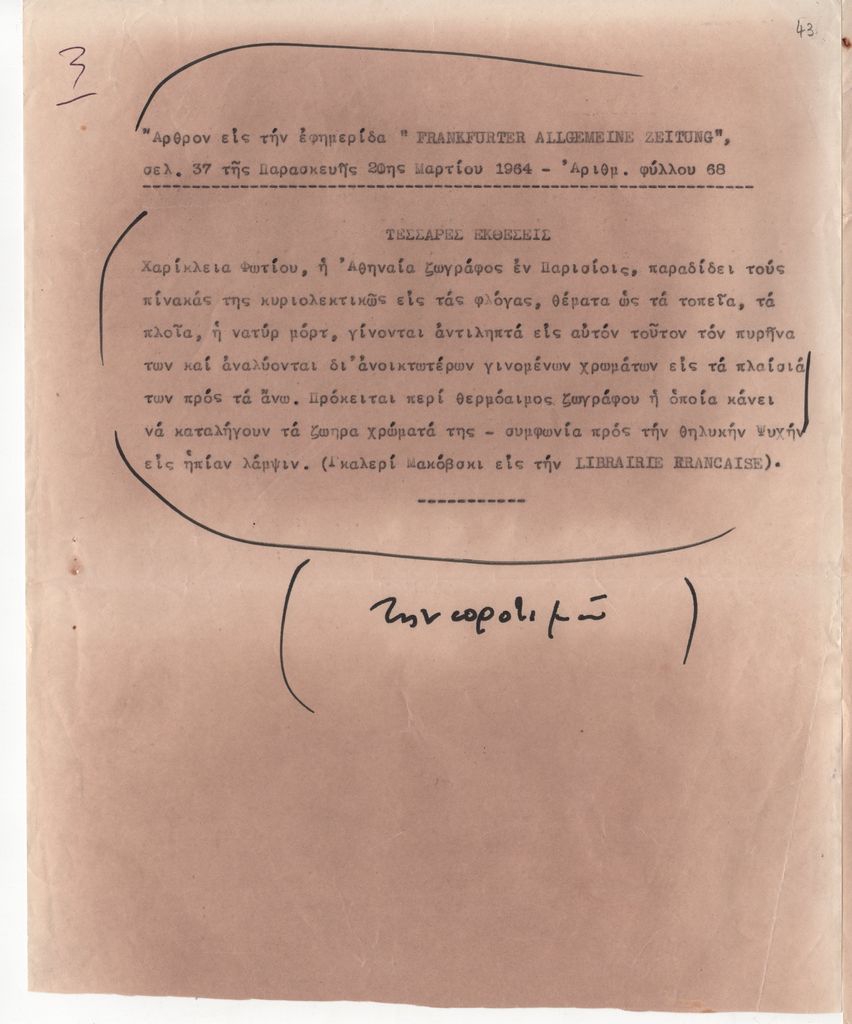 Κείμενο, δακτυλόγραφο, στα ελληνικά, σε χαρτί. Μετάφραση από τα γερμανικά κριτικής έκθεσης της Χαρίκλειας Φωτίου-Χατζησάββα στην Galerie Makowski, που δημοσιεύτηκε στην εφημερίδα Frankfurter Allgemaeine Zeitung το 1964. Στην επιφάνεια του τεκμηρίου επιγραφές.