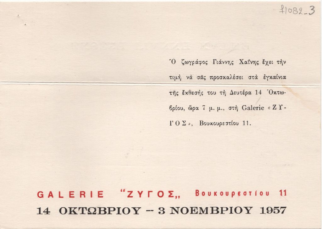 Έντυπο, στα ελληνικά, μονόφυλλο, χαρτόνι, 8,0×17,4 εκ. Πρόσκληση της ατομικής έκθεσης ζωγραφικής του Γιάννη Χαΐνη στην Αθήνα το 1957.