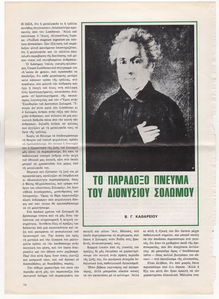 Απόκομμα, έντυπο, χαρτί ιλουστρέ, 2 φφ, 33,2×24,0 εκ., όπου δημοσιεύεται, στα ελληνικά, απόσπασμα άρθρου του Β.Γ. Καθάρειου για τον Διονύσιο Σολωμό.