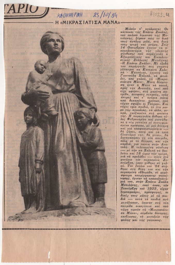 Απόκομμα, έντυπο, χαρτί, 22,5×15,0 εκ., όπου δημοσιεύεται, στα ελληνικά, άρθρο για τα αποκαλυπτήρια του αγάλματος «Η “Μικρασιάτισα μάνα”» της Κατερίνας Χαλεπά-Κατσάτου στην Επάνω Σκάλα Μυτιλήνης το 1984. Επάνω, επιγραφή.