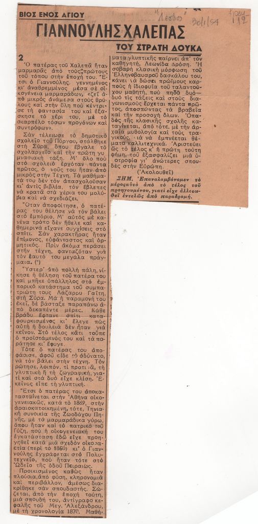 Απόκομμα, έντυπο, χαρτί, 27,0×12,5 εκ., όπου δημοσιεύεται, στα ελληνικά, το δεύτερο μέρος άρθρου του Στρατή Δούκα για τον Γιαννούλη Χαλεπά. Επάνω επιγραφή.