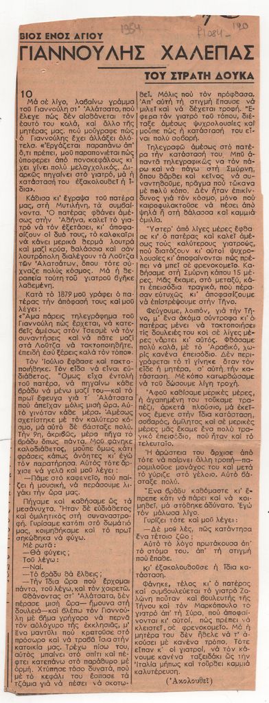 Απόκομμα, έντυπο, χαρτί, 28,5×10,5 εκ., όπου δημοσιεύεται, στα ελληνικά, το δέκατο μέρος άρθρου του Στρατή Δούκα για τον Γιαννούλη Χαλεπά. Επάνω επιγραφή.