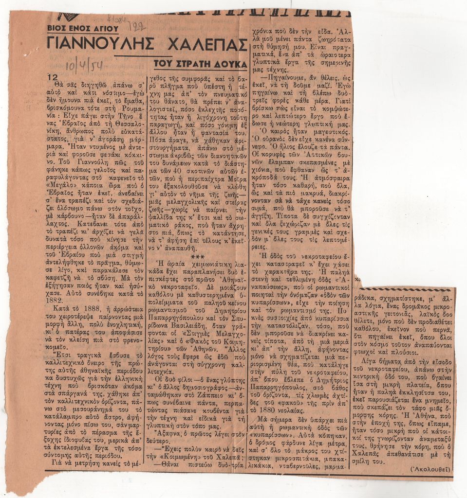 Απόκομμα, έντυπο, χαρτί, 23,0×22,0 εκ., όπου δημοσιεύεται, στα ελληνικά, το δωδέκατο μέρος άρθρου του Στρατή Δούκα για τον Γιαννούλη Χαλεπά. Επάνω επιγραφή.
