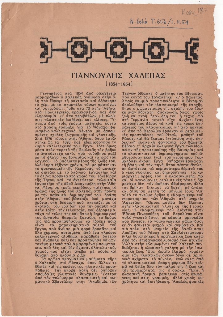 Απόκομμα, έντυπο, χαρτί, 2 φφ., 25,0×17,5 εκ., όπου δημοσιεύεται, στα ελληνικά, άρθρο του Δ.Ε. Ευαγγελίδη για τον γλύπτη Γιαννούλη Χαλεπά, με αφορμή τη συμπλήρωση εκατό χρόνων από τη γέννησή του. Στην πρώτη σελίδα, επιγραφή.
