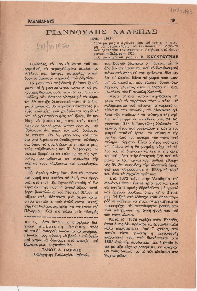 Απόκομμα, έντυπο, χαρτί, 24,5×16,8 εκ., όπου δημοσιεύεται, στα ελληνικά, άρθρο του Βάσου Κουντουρίδη για τον γλύπτη Γιαννούλη Χαλεπά. Στην πρώτη σελίδα, επιγραφή.