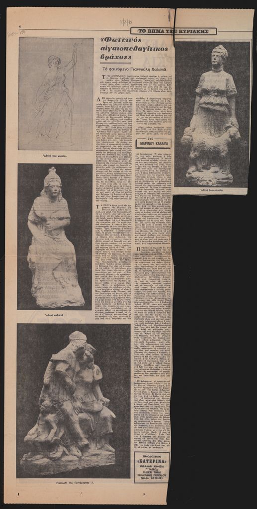 Απόκομμα, έντυπο, χαρτί, 64,0×31,5 εκ., όπου δημοσιεύεται, στα ελληνικά, άρθρο του Μαρίνου Καλλιγά για τον γλύπτη Γιαννούλη Χαλεπά, με αφορμή την κυκλοφορία της μελέτης του για τον καλλιτέχνη (έκδοση Εμπορικής Τράπεζας). Επάνω, επιγραφή.