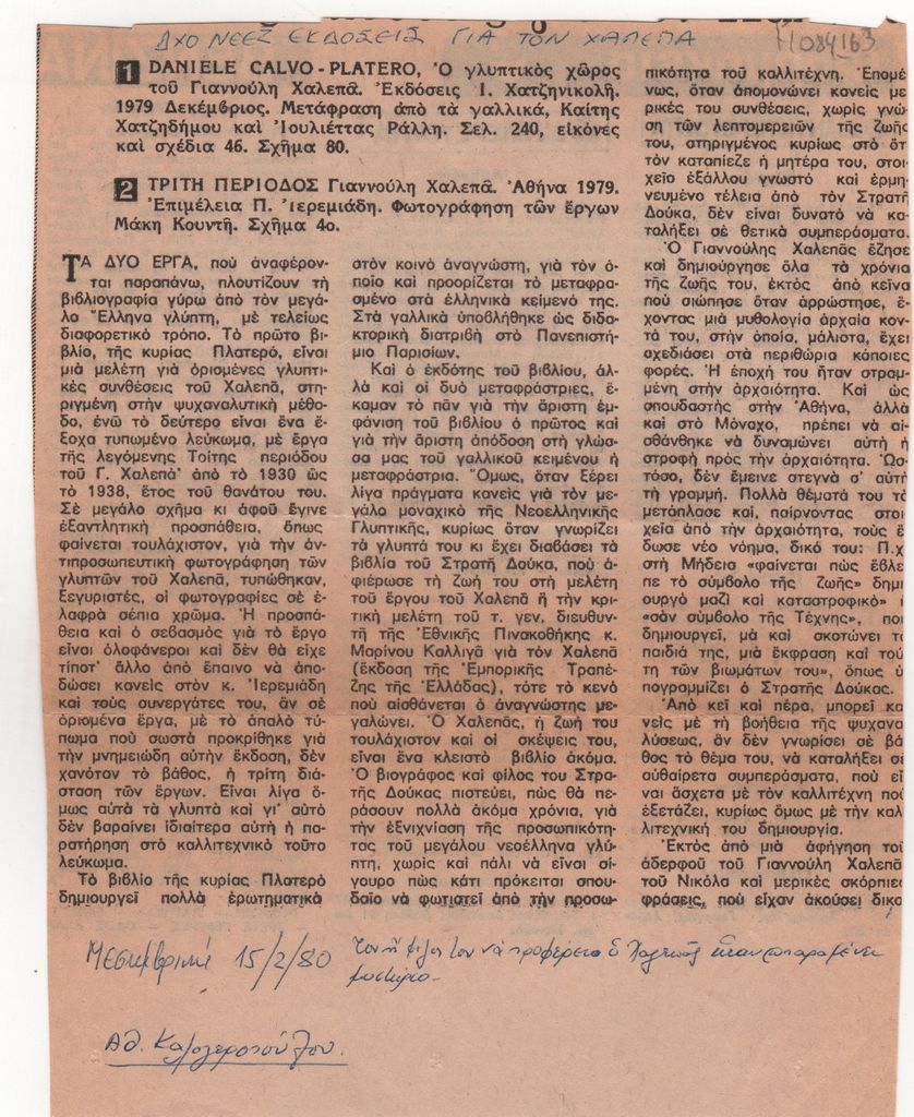 Απόκομμα, έντυπο, χαρτί, 19,0×15,0 εκ., όπου δημοσιεύεται, στα ελληνικά, βιβλιοπαρουσίαση της Αθηνάς Καλογεροπούλου για την μελέτη της Daniele Calvo Platero με τίτλο “Ο γλυπτικός χώρος του Γιαννούλη Χαλεπά” και το φωτογραφικό λεύκωμα “Τρίτη περίοδος Γιαννούλη Χαλεπά”. Επάνω και κάτω, επιγραφή.