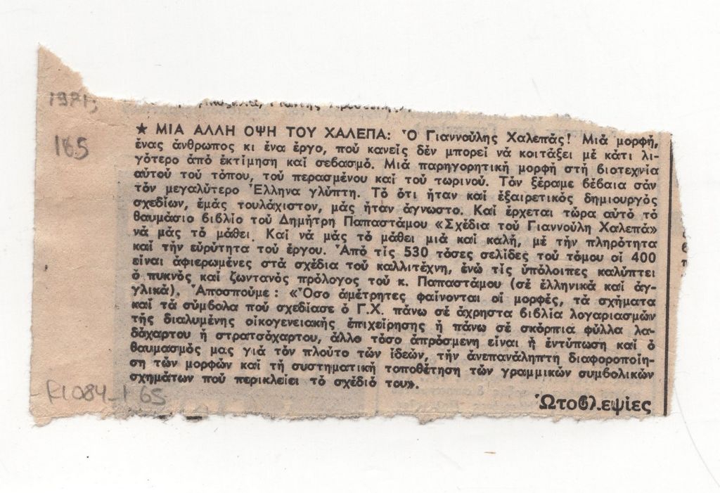 Απόκομμα, έντυπο, χαρτί, 7,0×12,0 εκ., όπου δημοσιεύεται, στα ελληνικά, παρουσίαση του λευκώματος του Δημήτριου Παπαστάμου με τίτλο “Σχέδια του Γιαννούλη Χαλεπά”. Εντάσσεται στη στήλη Ωτοβλεψίες.
