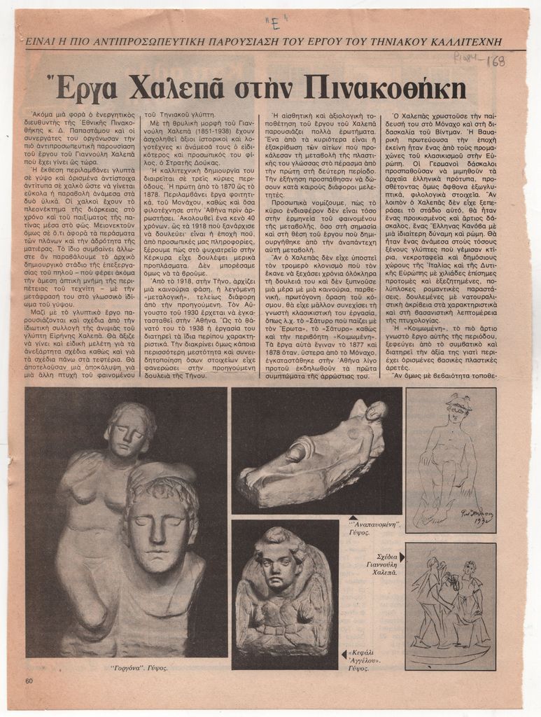 Απόκομμα, έντυπο, χαρτί, 2 φφ., 30,5×22,3 εκ., όπου δημοσιεύεται, στα ελληνικά, κριτική του Τώνη Σπητέρη για την αναδρομική έκθεση έργων του Γιαννούλη Χαλεπά στην Εθνική Πινακοθήκη στην Αθήνα το 1978. Στην πίσω όψη του πρώτου φύλλου, εκθεσιολόγιο της περιόδου και πολιτιστική επικαιρότητα. Στην πίσω όψη του δεύτερου φύλλου, απόσπασμα κριτικής του Φοίβου Ανωγειανάκη με τίτλο “Η κρατική με τον Α. Συμεωνίδη”, όπου γίνεται κριτική και άλλων συναυλιών της περιόδου.
