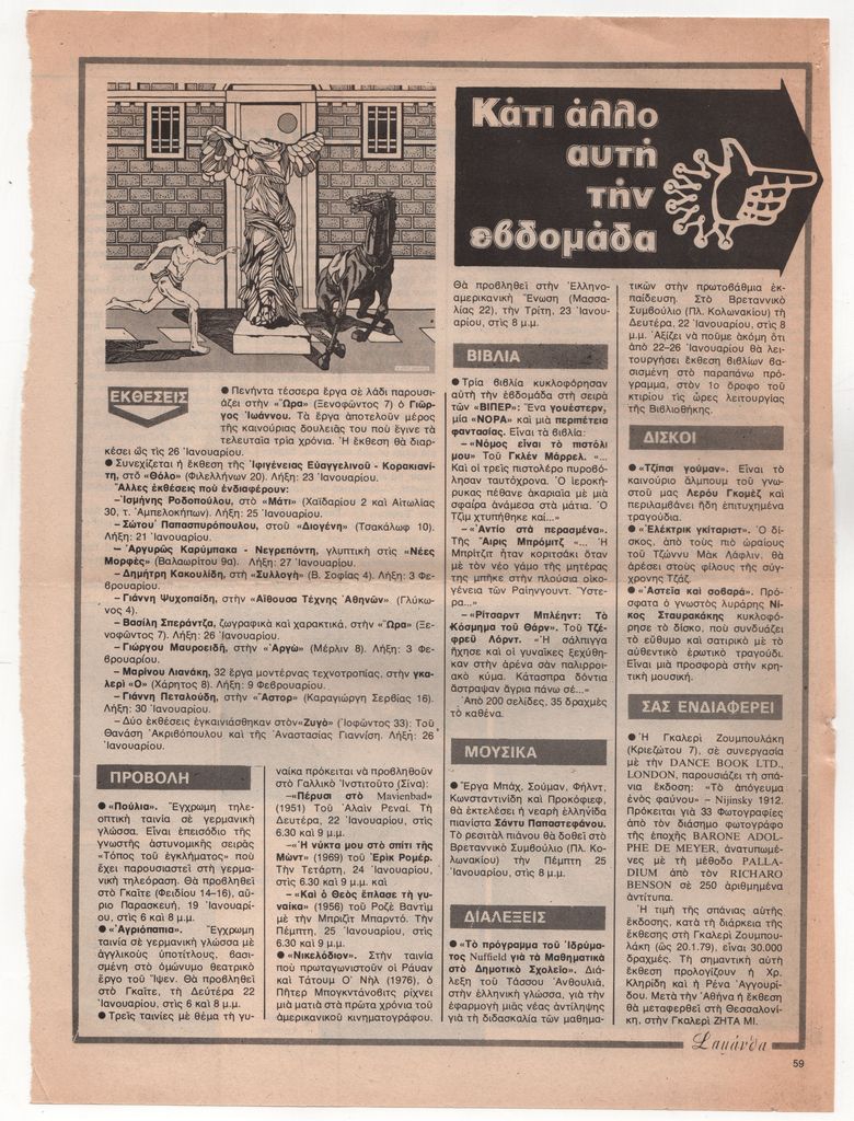 Απόκομμα, έντυπο, χαρτί, 2 φφ., 30,5×22,3 εκ., όπου δημοσιεύεται, στα ελληνικά, εκθεσιολόγιο της περιόδου Ιανουάριος-Φεβρουάριος 1979. Επίσης, εκδόσεις, κινηματογραφικές προβολές, μουσικά, διαλέξεις και δισκοπαρουσιάσεις.