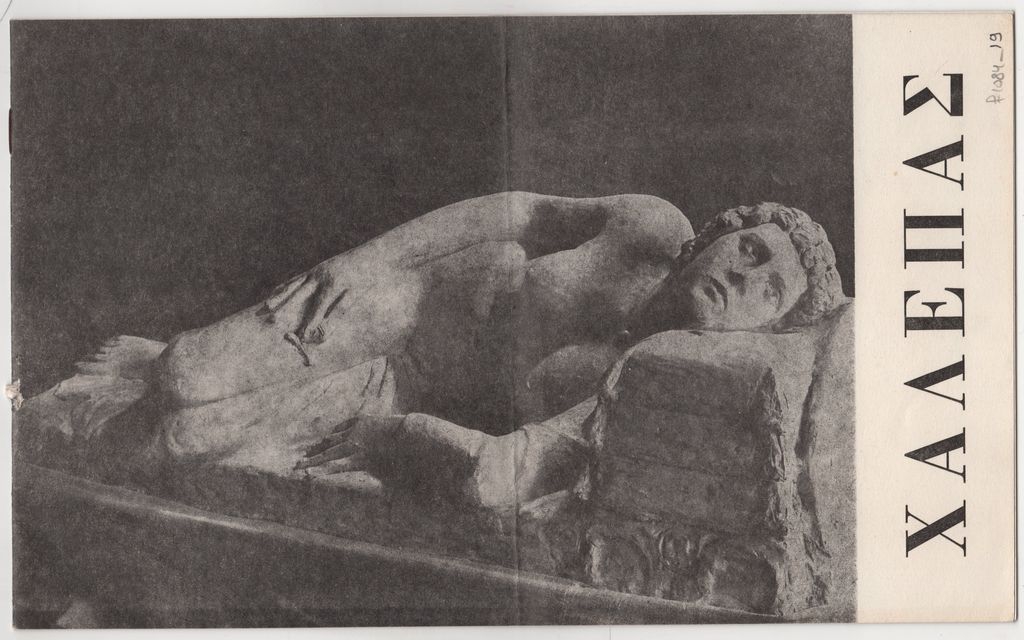 Έντυπο, στα ελληνικά, πολυσέλιδο, χαρτί, 17,0×27,7 εκ. Κατάλογος της ατομικής έκθεσης έργων του Γιαννούλη Χαλεπά στην Αθήνα το 1964/5. Περιέχει κείμενα των Δ. Πικιώνη, Μ. Καλλιγά και Στρ. Δούκα, βιογραφικό σημείωμα του καλλιτέχνη και κατάλογο έργων. Στο πλαίσιο της έκθεσης ομιλίες πραγματοποίησαν οι: Γιάννης Τσαρούχης και Άγγελος Προκοπίου