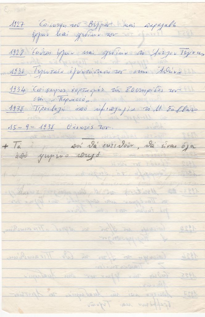 Κείμενο, χειρόγραφο, με μπλε μελάνι, στα ελληνικά, σε χαρτί, 30,3×20,0 εκ. Βιογραφικό σημείωμα του γλύπτη Γιαννούλη Χαλεπά οργανωμένο χρονολογικά.