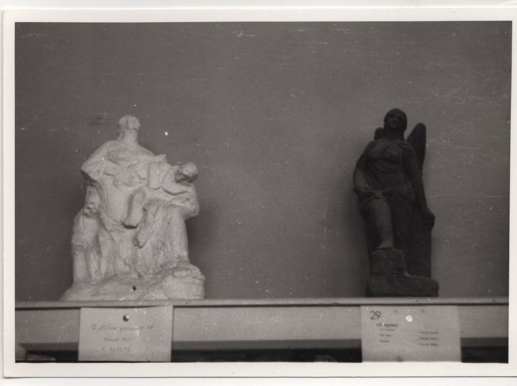 Φωτογραφία, α/μ, φωτογραφικό χαρτί, 9,0×12,8 εκ. Άποψη έκθεσης έργων του Γιαννούλη Χαλεπά στο Ίδρυμα Ευαγγελίστριας Τήνου. Διακρίνονται τα έργα “Ο Άγγελος” και “Η Μήδεια φονεύουσα τα τέκνα της”. Στην πίσω όψη επιγραφή.