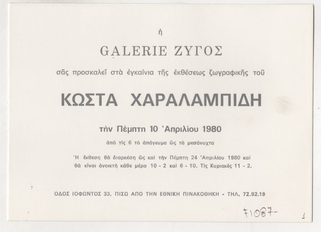 Πρόσκληση, χαρτόνι, 12×17 εκ., στα ελληνικά, εγκαινίων έκθεσης του Κώστα Χαραλαμπίδη.