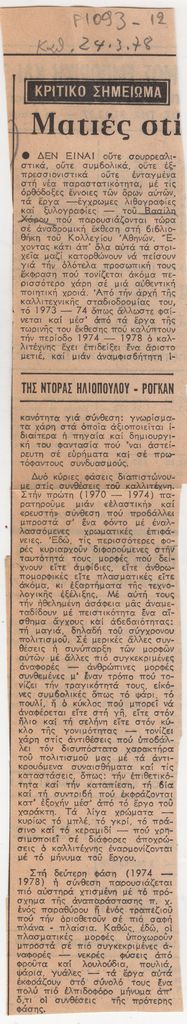 Απόκομμα, χαρτί,30×5 εκ., στα ελληνικά, δημοσίευσης κριτικής έκθεσης του Βασίλη Χάρου στο Κολλέγιο Αθηνών.