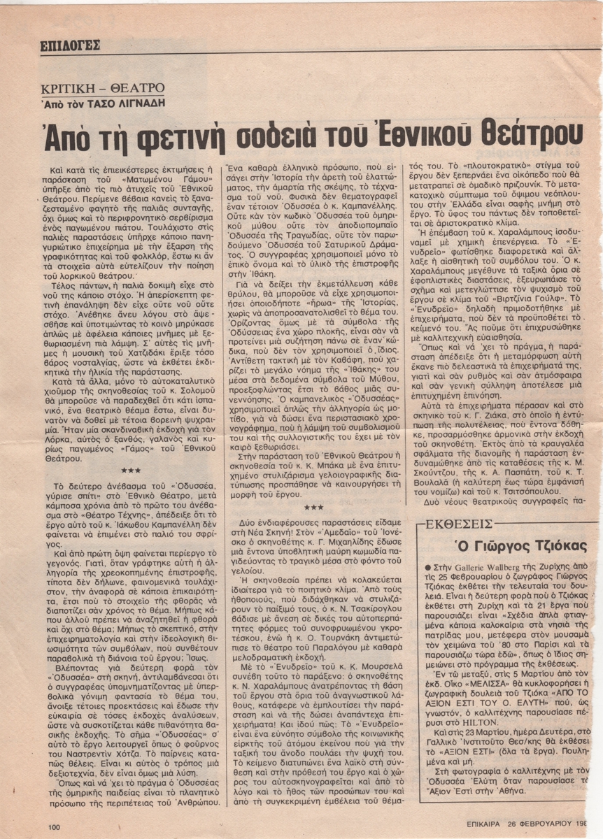 Απόκομμα, χαρτί, 29.5×21 εκ., στα ελληνικά, δημοσίευσης κριτικής των θεατρικών παραστάσεων της περιόδου.