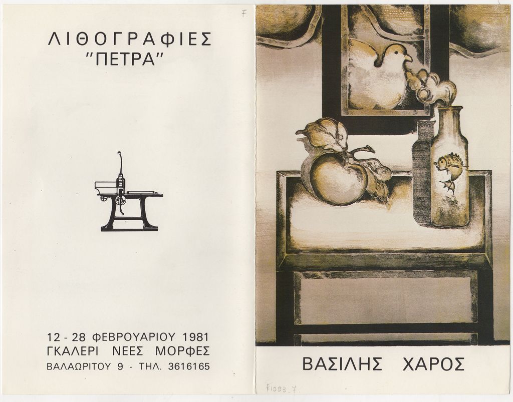Έντυπο, χαρτόνι, 23.5×15 εκ., στα ελληνικά, έκθεσης λιθογραφίας του Βασίλη Χάρου. Περιέχει κείμενο του καλλιτέχνη και εικονογράφηση.