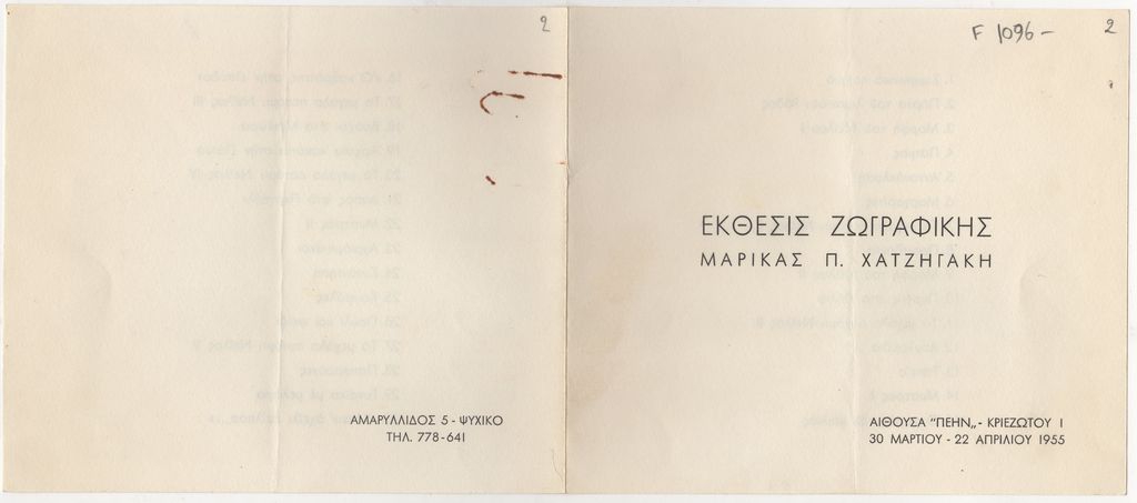 Έντυπο, χαρτί, 15×17.5 εκ., στα ελληνικά, έκθεσης της Μαρίας Χατζηγάκη.