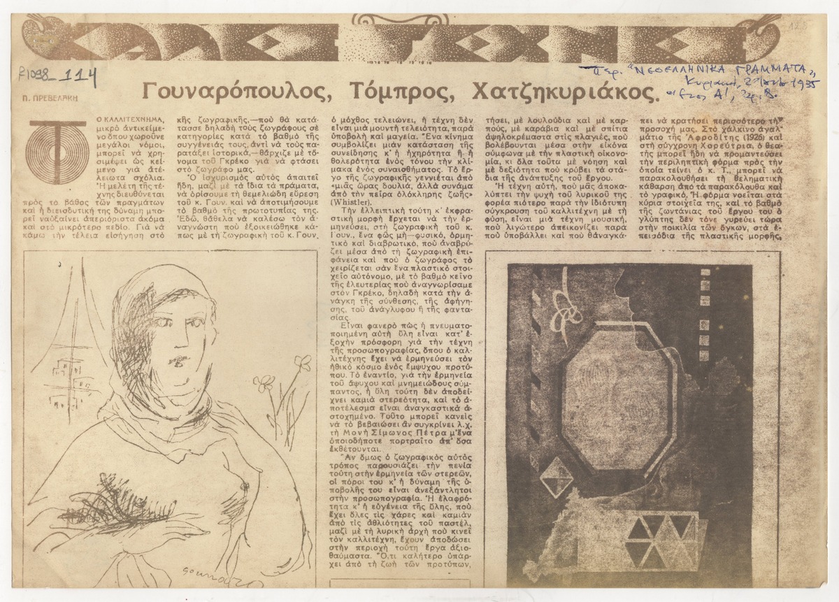 Φωτοαντίγραφο αποκόμματος της εφημερίδας “Νεοελληνικά γράμματα” (02/07/1935), όπου δημοσιεύεται κριτική έκθεσης των Γουναρόπουλου, Τόμπρου και Χατζηκυριάκου-Γκίκα, οι οποίοι παρουσιάζουν έργα τους στο Ατελιέ.