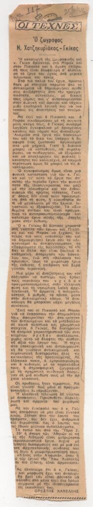 Απόκομμα εφημερίδας (25/11/1946), όπου δημοσιεύεται κριτική της ζωγραφικής του Νίκου Χατζηκυριάκου-Γκίκα.