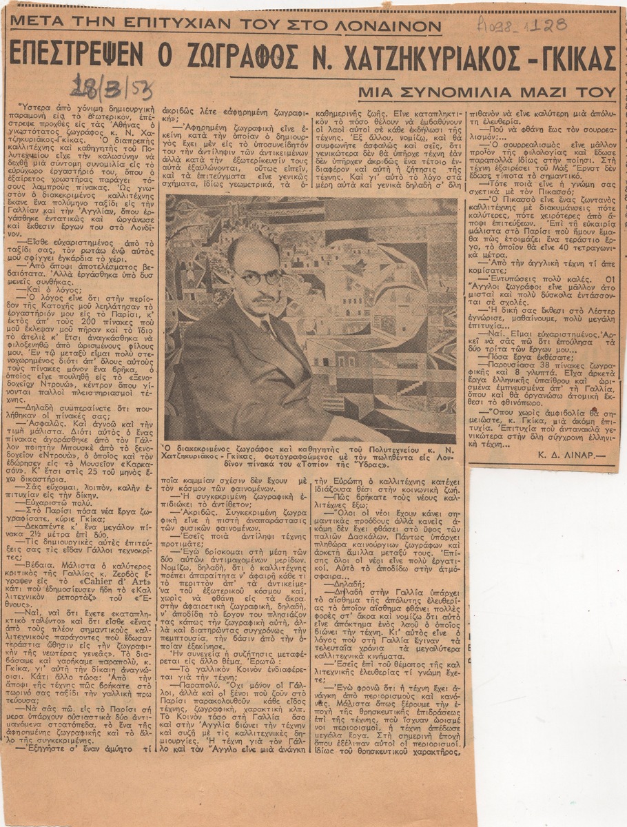 Απόκομμα εφημερίδας (18/03/1953), όπου δημοσιεύεται συνέντευξη του Νίκου Χατζηκυριάκου-Γκίκα, στην οποία μιλά για τις εντυπώσεις του από έκθεση του στο Λονδίνο, για τη ζωγραφική του, για την Τέχνη στο εξωτερικό.