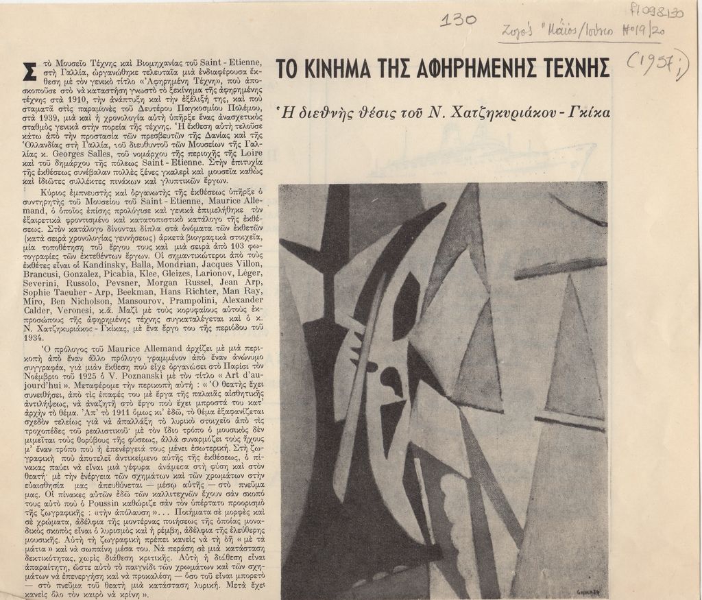Απόκομμα του περιοδικού “Ζυγός”, τεύχος 19-20 (05-06/1967), όπου δημοσιεύεται άρθρο με θέμα την έκθεση αφηρημένης Τέχνης στο Μουσείο Τέχνης και Βιομηχανίας του St. Etienne στη Γαλλία, στην οποία συμμετείχε με έργο του ο Νίκος Χατζηκυριάκος-Γκίκας.