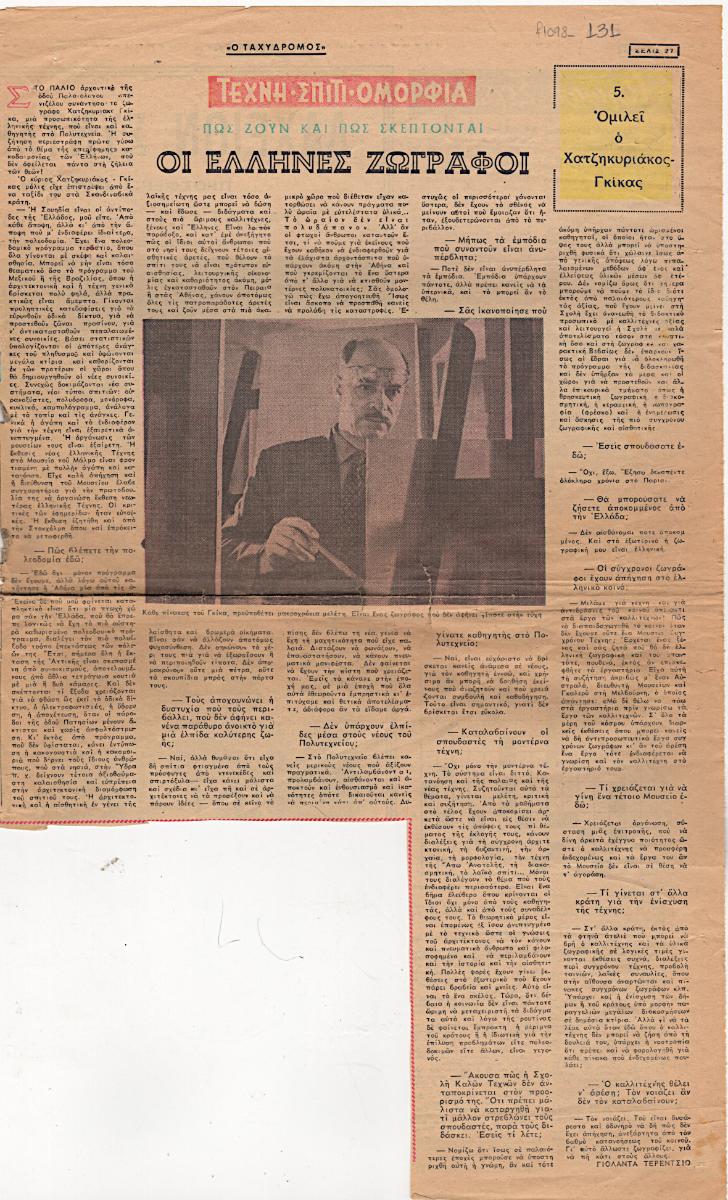 Απόκομμα του περιοδικού “Ο Ταχυδρόμος”, όπου δημοσιεύεται συνέντευξη του Νίκου Χατζηκυριάκου-Γκίκα, στο πλαίσιο έρευνας του εντύπου για τους Έλληνες καλλιτέχνες.