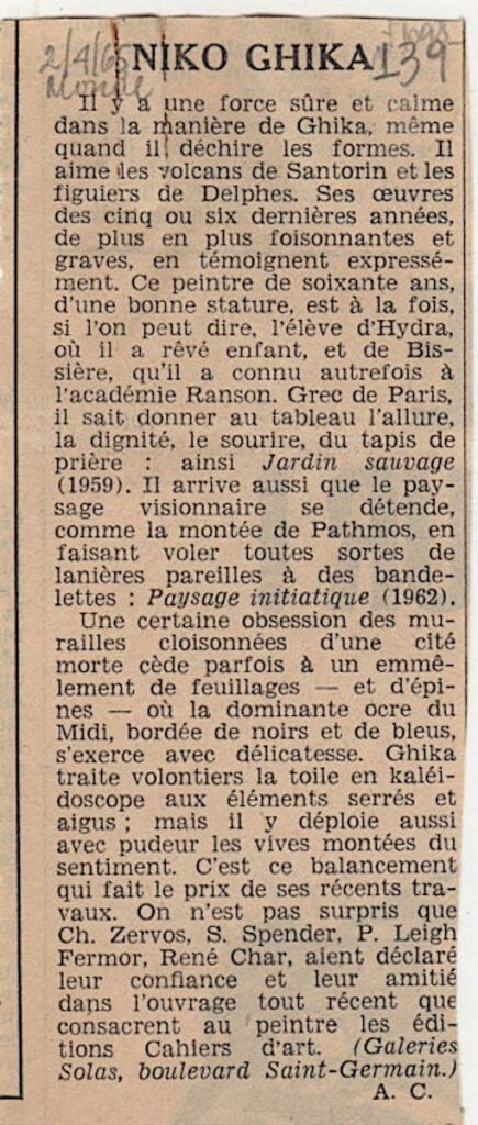 Απόκομμα της εφημερίδας “Le Monde” (02/04/1965), όπου δημοσιεύεται κριτική έκθεσης του Νίκου Χατζηκυριάκου Γκίκα, η οποία διεξάγεται στην γκαλερί Αλέξανδρου Ιόλα στο Παρίσι.