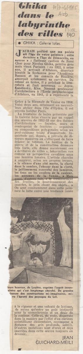 Απόκομμα της εφημερίδας “Arts” (31/03/1965), όπου δημοσιεύεται κριτική έκθεσης του Νίκου Χατζηκυριάκου-Γκίκα, η οποία διεξάγεται στην γκαλερί Ιόλα στο Παρίσι.