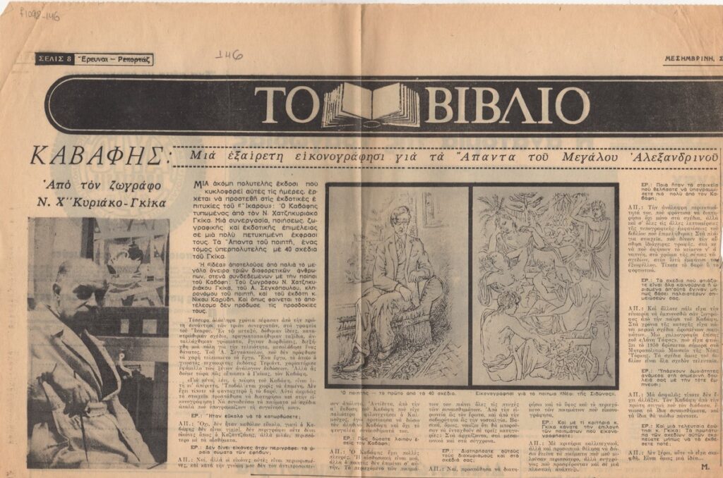 Απόκομμα εφημερίδας (10/1966), όπου δημοσιεύεται συνέντευξη του Νίκου Χατζηκυριάκου-Γκίκα. Ο καλλιτέχνης μιλά για την εικονογράφηση τόμου ποιημάτων του Κ. Καβάφη, που κυκλοφορεί από τις εκδόσεις Ίκαρος.