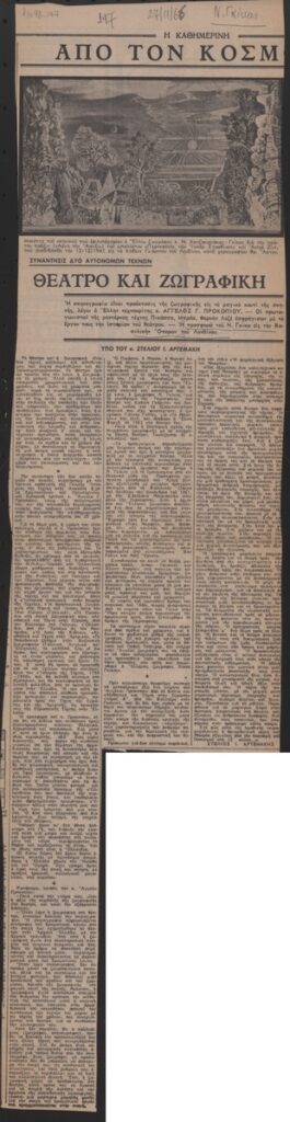Απόκομμα της εφημερίδας “Η Καθημερινή” (27/11/1966), χαρτί, στα ελληνικά, δημοσίευσης συνέντευξης του Άγγελου Προκοπίου, αναφορικά με τη σχέση Θεάτρου και Ζωγραφικής. Ο Προκοπίου αναφέρεται σε καλλιτέχνες που ασχολήθηκαν με τη σκηνογραφία και ειδικότερα στον Νίκο Χατζηκυριάκο-Γκίκα.