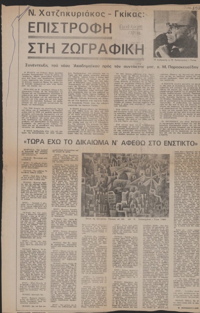 Απόκομμα της εφημερίδας “Ελεύθερος Κόσμος” (19/03/1972), όπου δημοσιεύεται συνέντευξη του Νίκου Χατζηκυριάκου-Γκίκα. Ο καλλιτέχνης μιλά για την εκλογή του στην Ακαδημία Αθηνών, για την νεοελληνική ζωγραφική, για το έργο του.