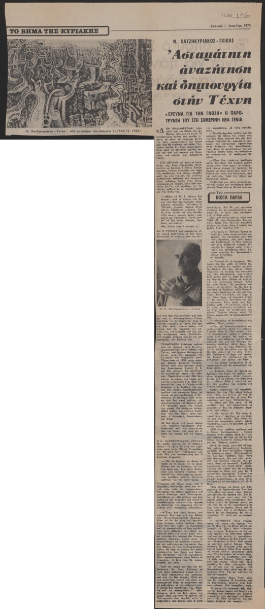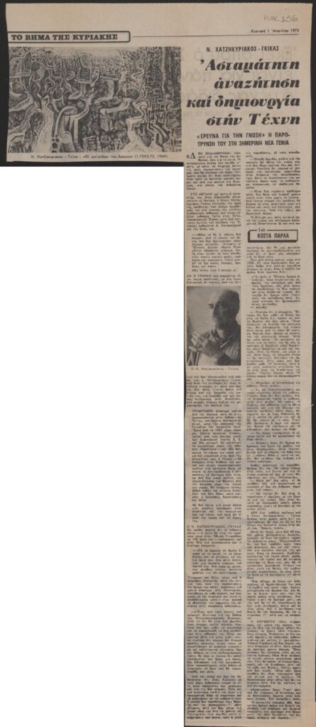 Απόκομμα της εφημερίδας “Το Βήμα” (01/04/1973), όπου δημοσιεύεται άρθρο με θέμα την έκθεση του Νίκου Χατζηκυριάκου-Γκίκα, η οποία διεξάγεται στην Ελληνοαμερικανική Ένωση Αθηνών. Δίνονται αποσπάσματα απόψεων του καλλιτέχνη για το έργο του και τη νεοελληνική ζωγραφική.